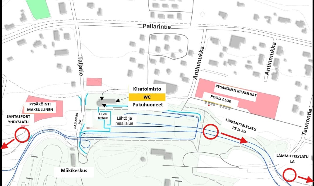 Kilpailijoiden pysäköinti hiihtostadionin itäpuoleisella P-alueella (poolialue).
