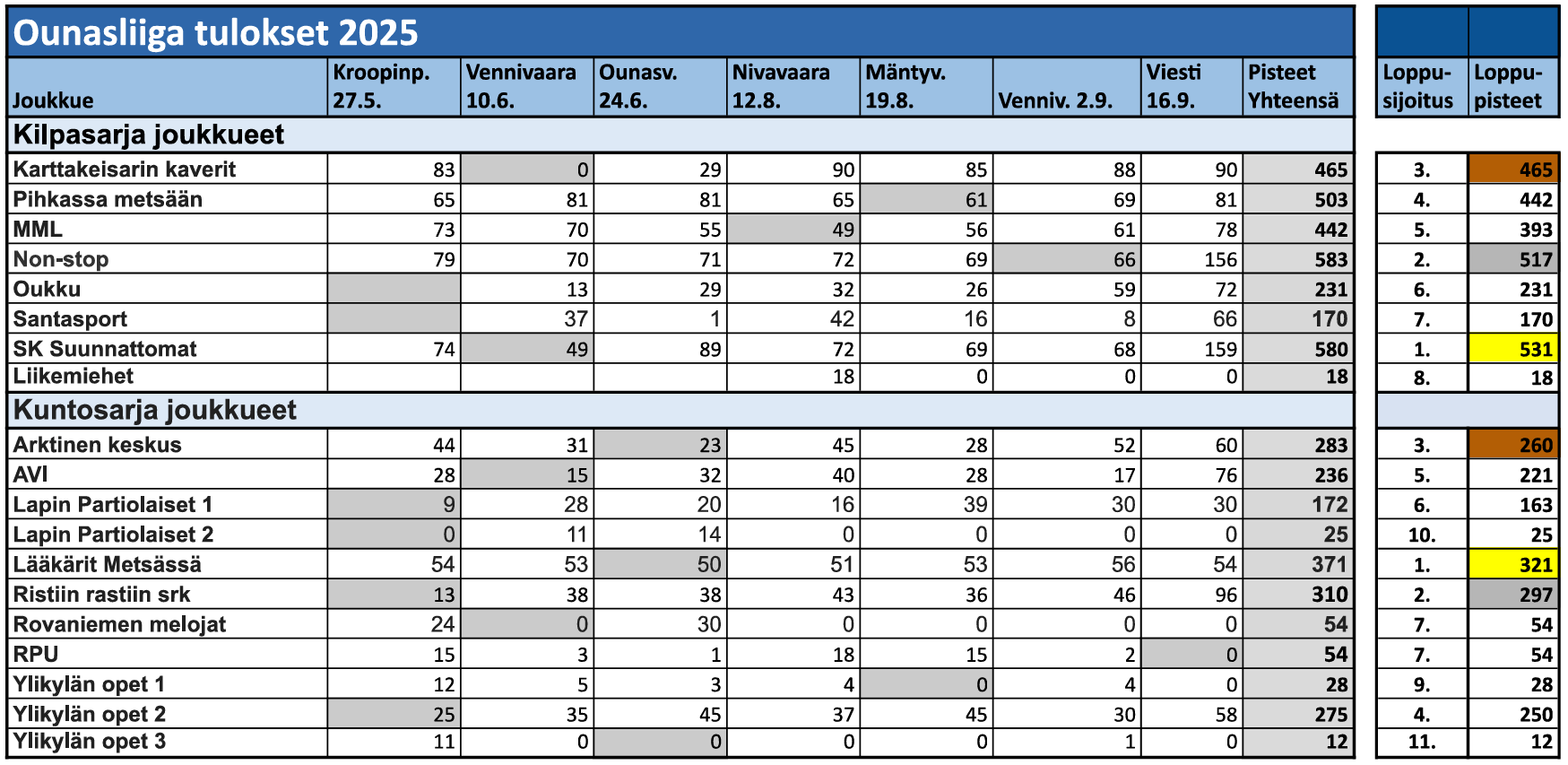 - Sijoituspisteet lasketaan joukkueen kolmelle parhaiten sijoittuneelle suunnistajalle – muille joukkueen jäsenille tulee hyväksytystä suorituksesta osallistumispiste (1 p).